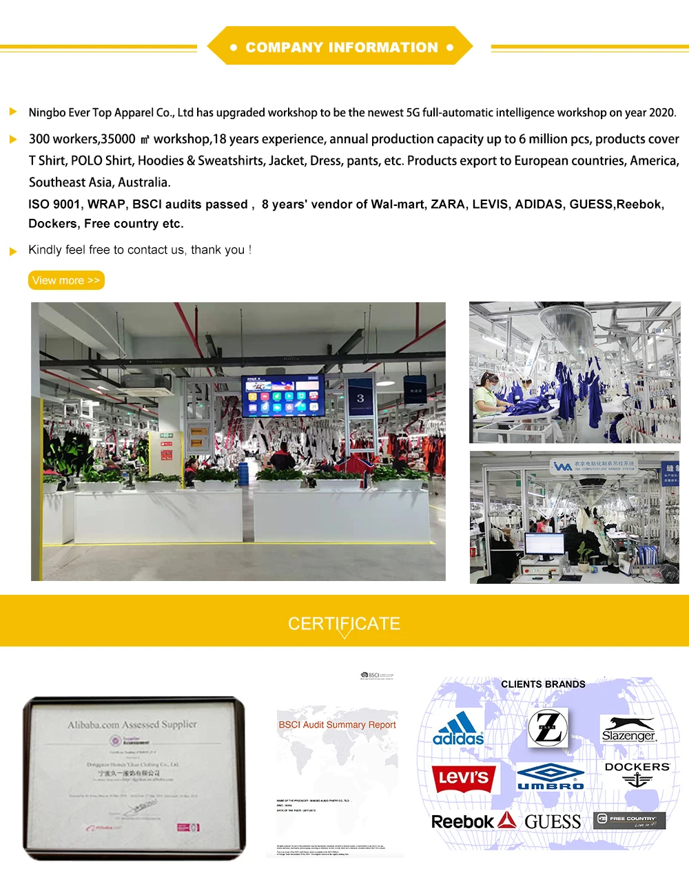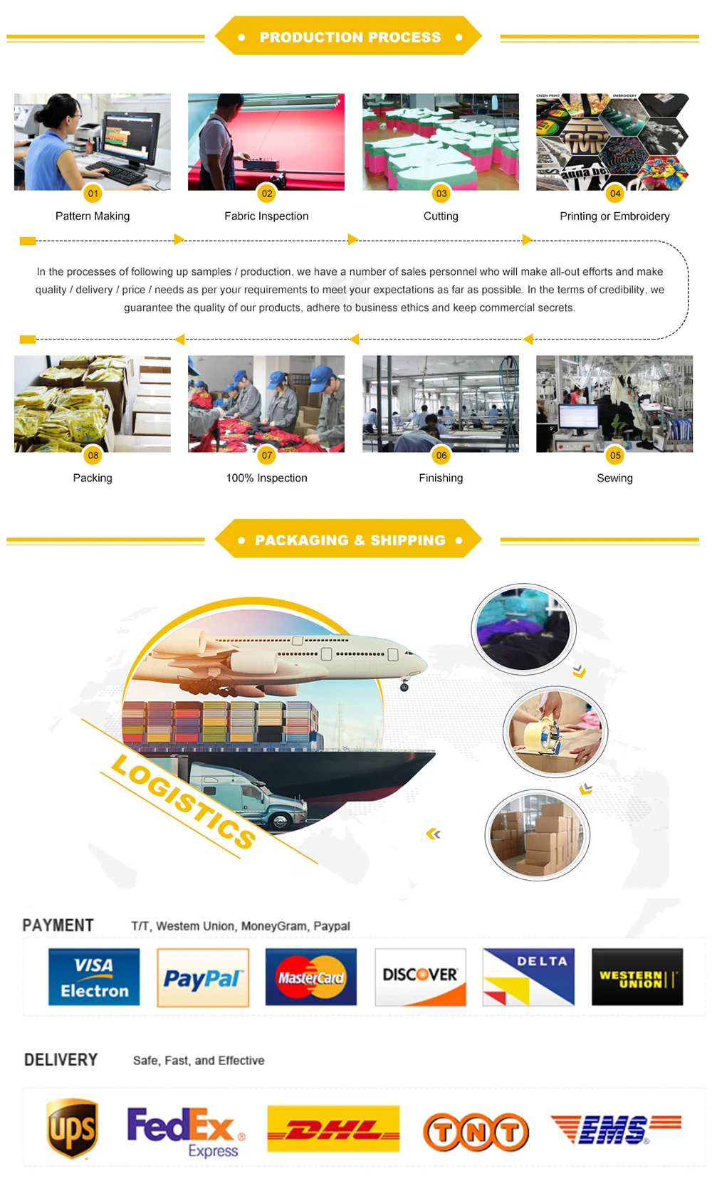 Are you a factory or trading company? We're a direct factory, engaged in the line of Tee shirt, hoodie,sportswear, gym wear, yago wear ect. for more than 18 years. Can accept the OEM/ODM order ? yes, we can offer the OEM/ODM according the customer design. Do you inspect the finished products? Yes, each of production and finished products will be carried out inspect by QC before shipping. How can I get a sample to confirm the quality ? --You could give us exact fabric composition, size chart and details artwork, we'll arrange sample as per your require. --You could send us a sample or design artwork,we can make a counter sample based on original sample or your design. What is your payment terms? TT / Western Union / Paypal / Money Garm / LC etc. What advantages do you have ? --First hand price without price spread for middle party. --Low MOQ Custom, big factory, high quality . --Great service, On time delivery --On time delivery. What is your delivery time? Can i receive goods on time? --Samples: 10-15 days after details confirmed. --Mass production: 20-30 days after pre-production sample confirmed. --We regard clients time as gold, so we will do our best to delivery goods on time.